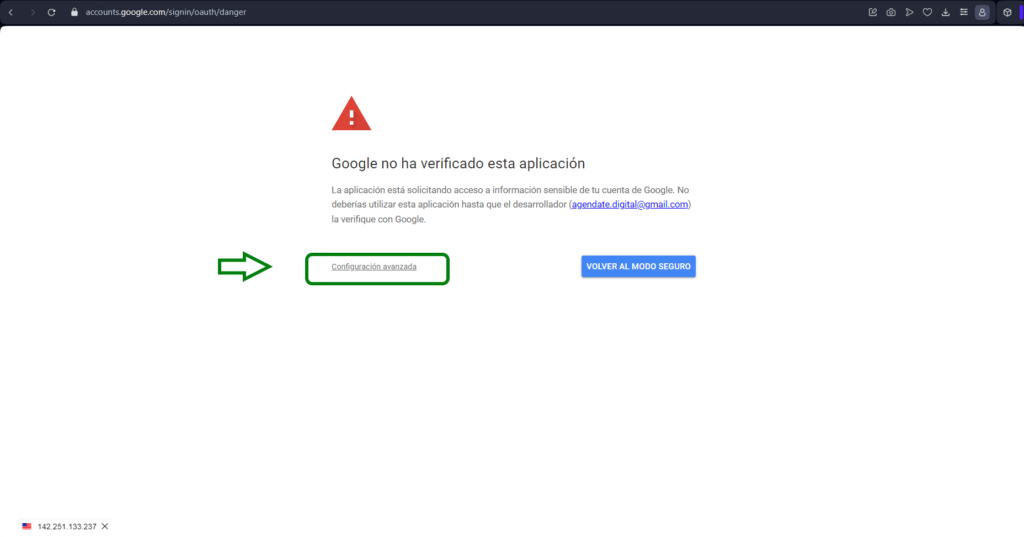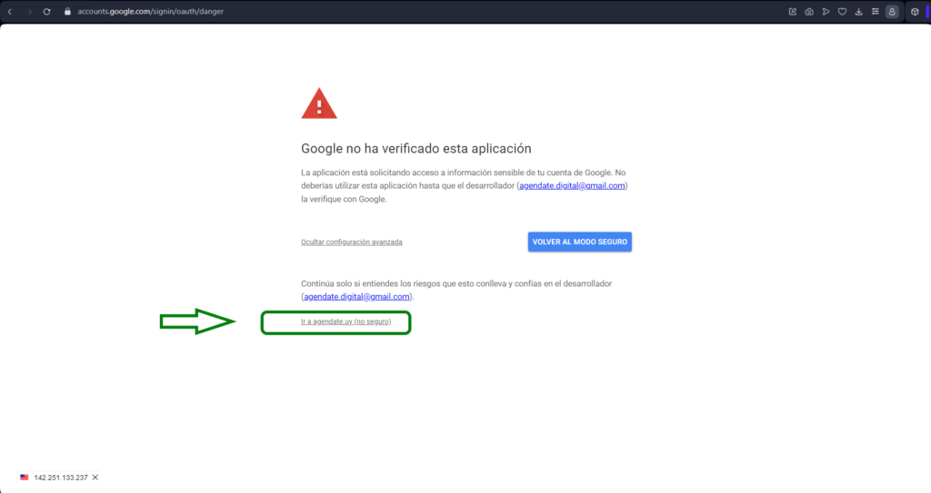 Google aun no ha pasado el proceso de certificación de la aplicacion es relacionado a eso. Debes darle en «Configuración Avanzada»