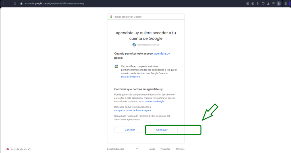 Haz clic en «Continuar» para permitir que Agendate se pueda sincronizar con tu Calendario de Google
