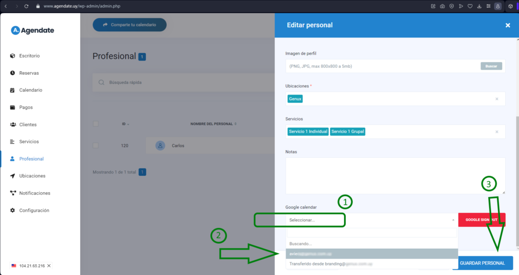 Ahora solo debes elegir cual de tus Calendarios que tengas creados en esa cuenta de Google Calendar vas a asociar a ese Perfil de Agendate que estas vinculando.