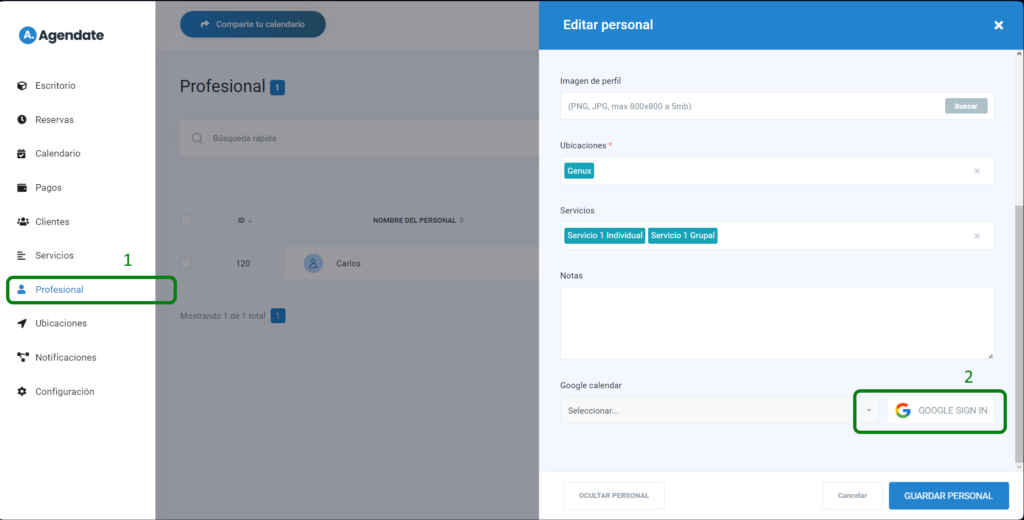 Ve a la pagina de "Profesionales" en tu panel de Agendate